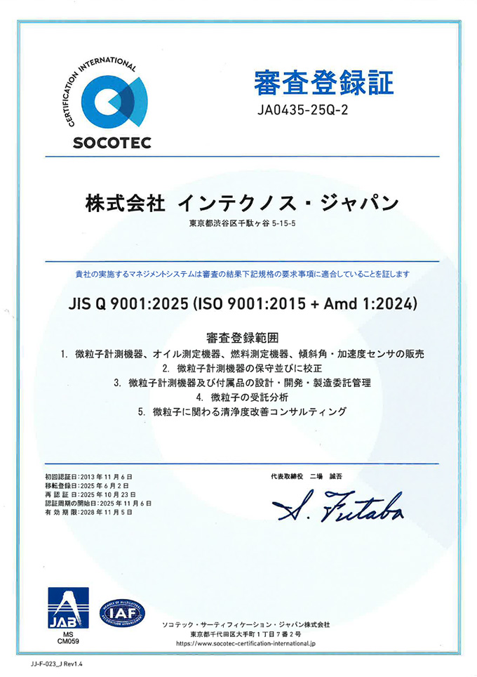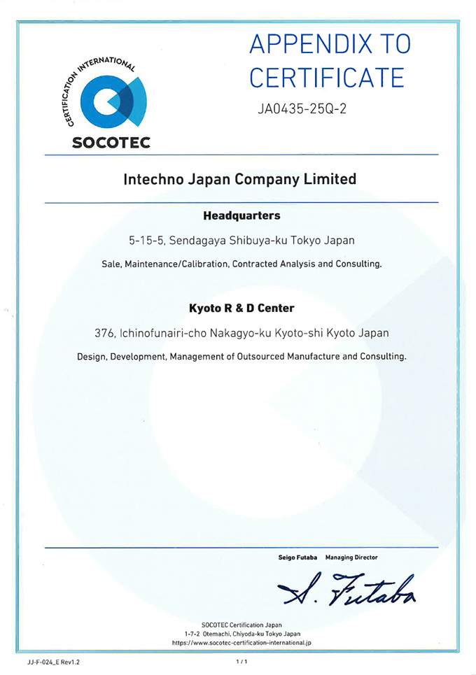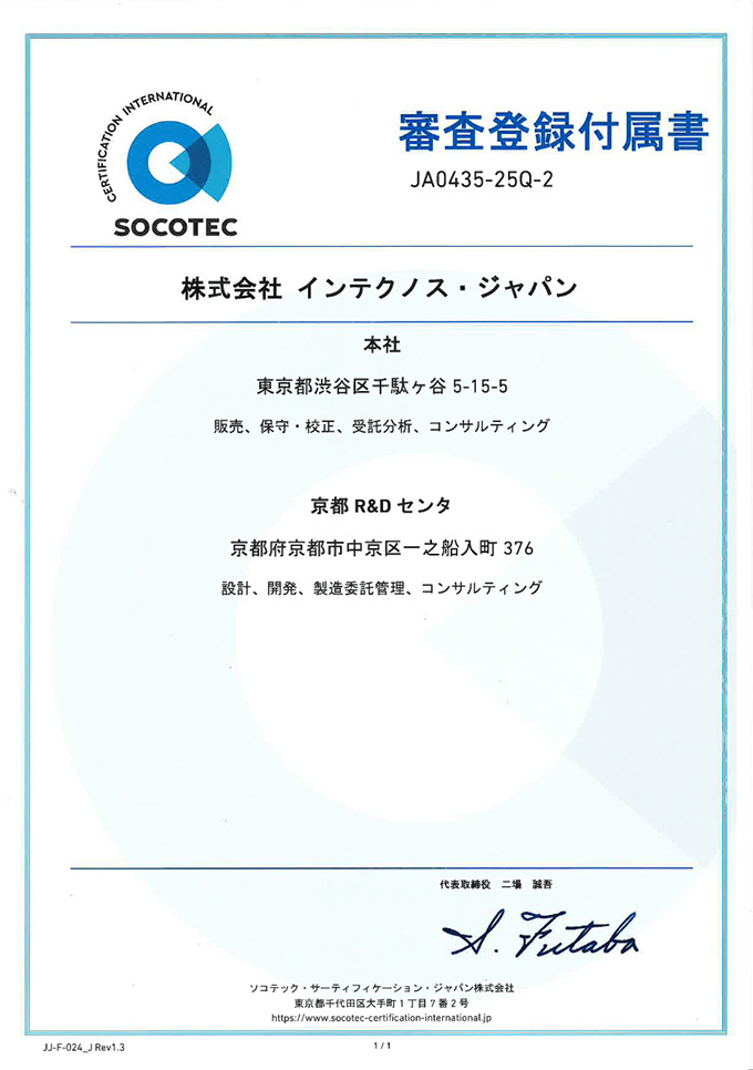 インテクノスは、優れた品質の製品を継続的に提供する為、品質マネジメントシステムを構築しISO9001の認証を取得しました。