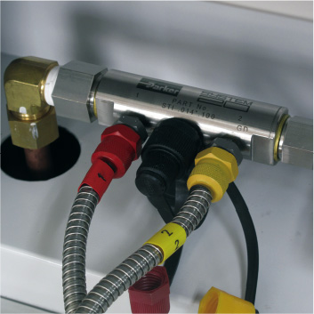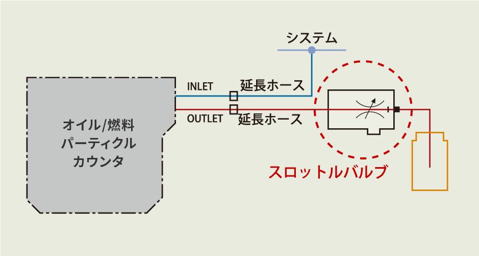 流量が安定しない場合や粘度が高い油を測定する場合にパーティクルカウンタのOUT側に取り付けて使用します