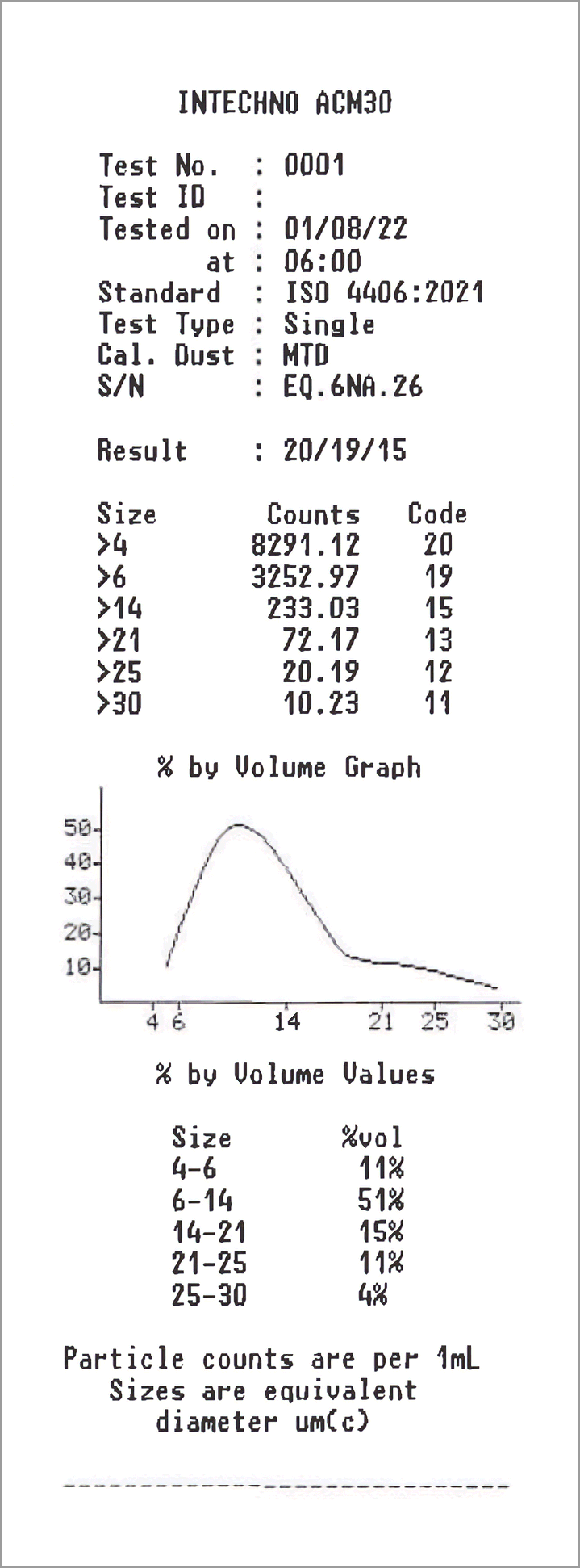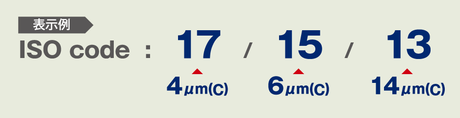 サンプル中の粒子数を>4,>6,>14µmという各微粒子の粒径範囲に区分し、1ml中の粒子数から割り当てられるスケール番号(0 ~ 28)を斜線(/)によって3桁に区分表示します。